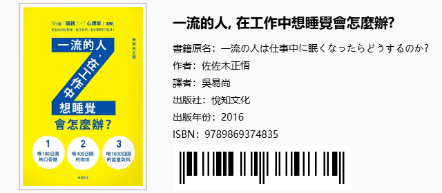 佐佐木正悟。《一流的人,在工作中想睡覺會怎麼辦?》(原書名:一流の人は仕事中に眠くなったらどうするのか?)。吳易尚 譯。臺北:悅知文化,2016。ISBN:9789869374835。 |